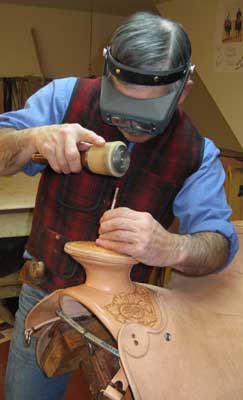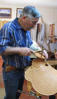 Steve pays a lot of attention to the details, the ground seat, rig placement, hand and machine stitching and smoothness of the stamping. He particularly likes clean, crisp carving and stamping. Many people don’t realize there are about 100 individual pieces to a saddle. They have to fit together smooth and tight. It’s important to be particular, from shaping the ground seat to sewing the last stitch on the cantle. You can’t be sloppy about it.